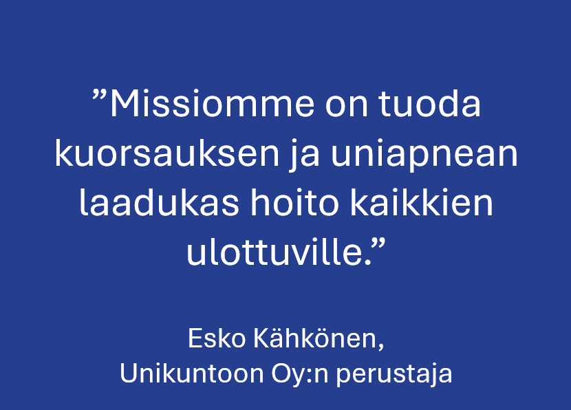 Lähdimme kaksi vuotta sitten kehittämään uutta ratkaisua uniapnean hoitoon. Tavoitteenamme oli kaataa kansantautia kotimaisin voimin käyttämällä uusinta tekniikkaa. Omaa suomalaista innovaatiotamme Unikuntoon.fi-uniapneakiskoa myydään nyt yhteistyöhammaslääkäriemme kautta hyvin tuloksin.